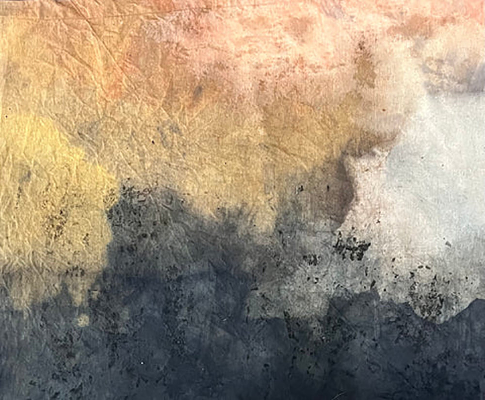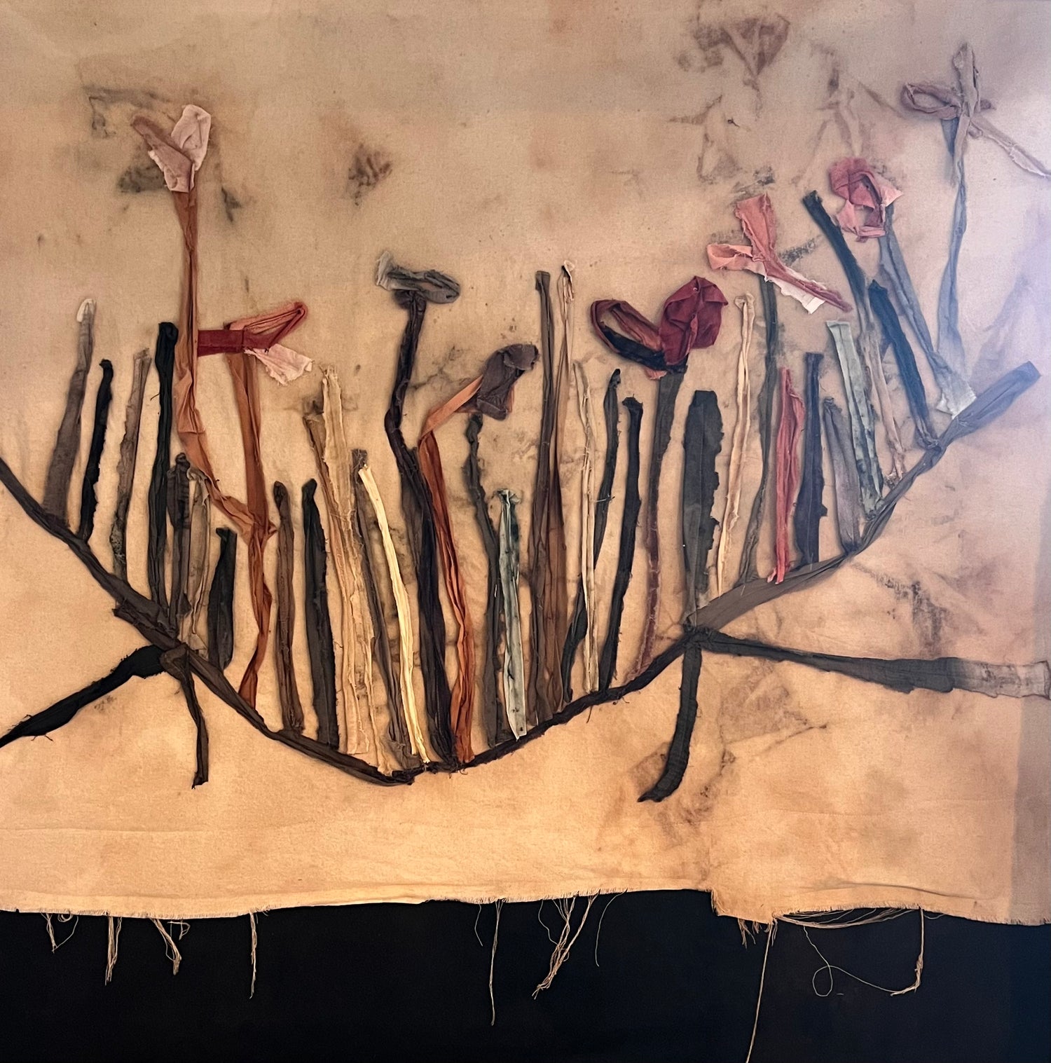 Natural dyes pomegranate, madder root, mulberry, marigold, logwood, oak, iron on hemp twill from Cone Mills.