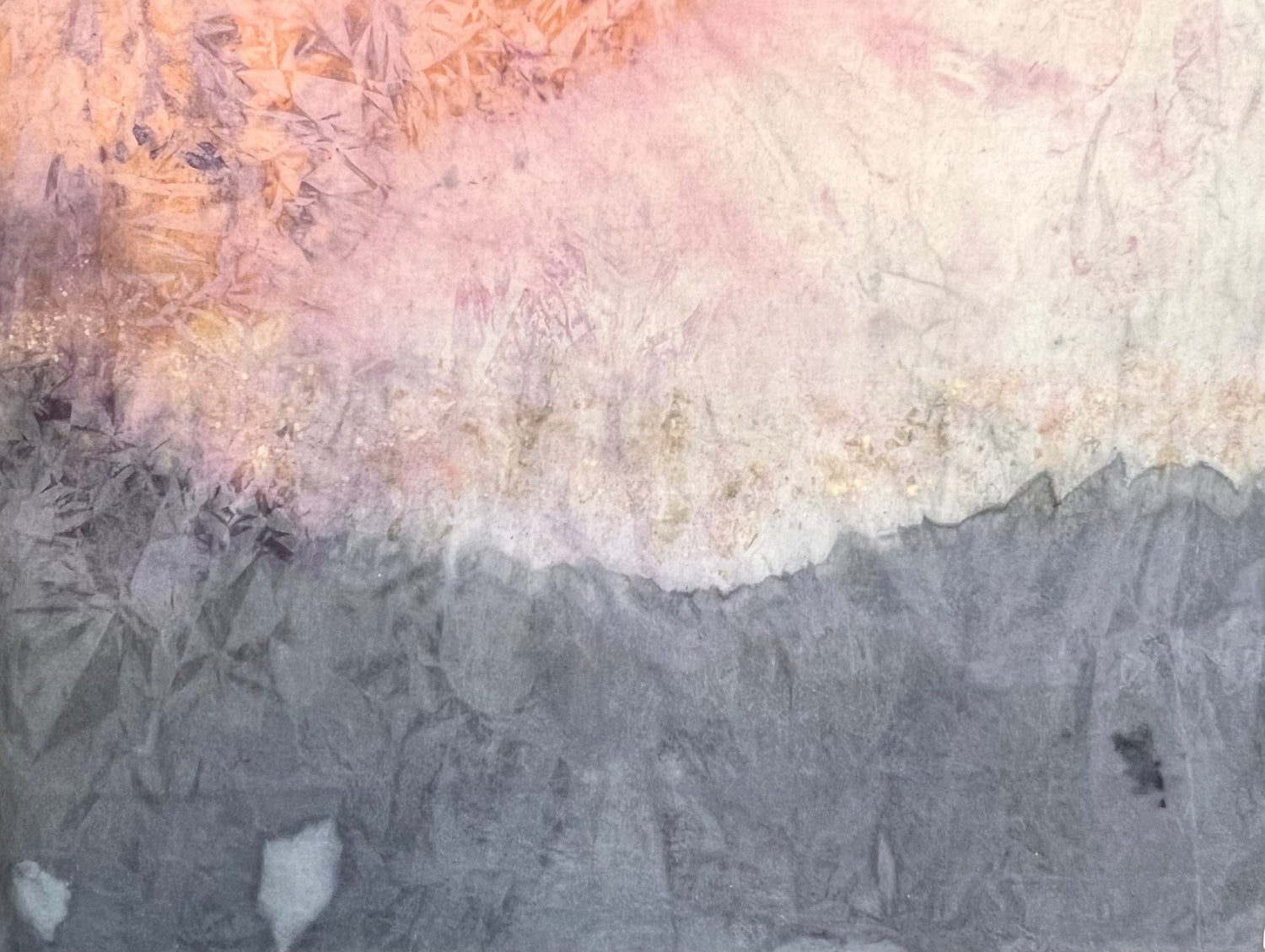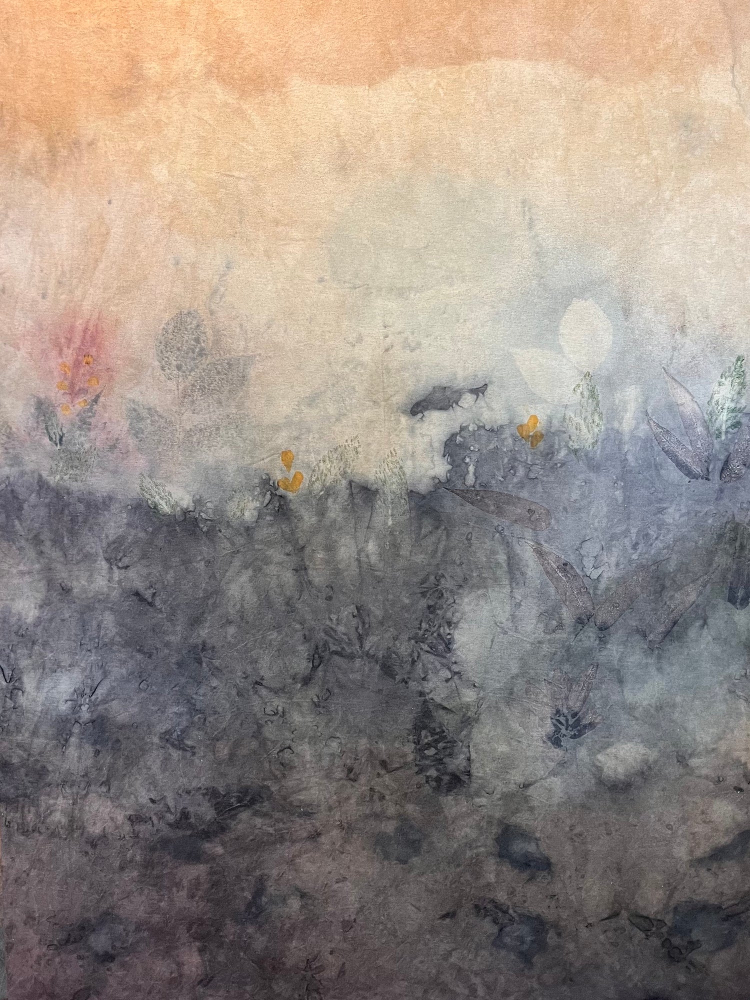 Dyed with madder root, rhubarb, marigolds, cutch, mulberry bark and iron. Botanically sprinkled with marigolds, cosmos and dahlias.