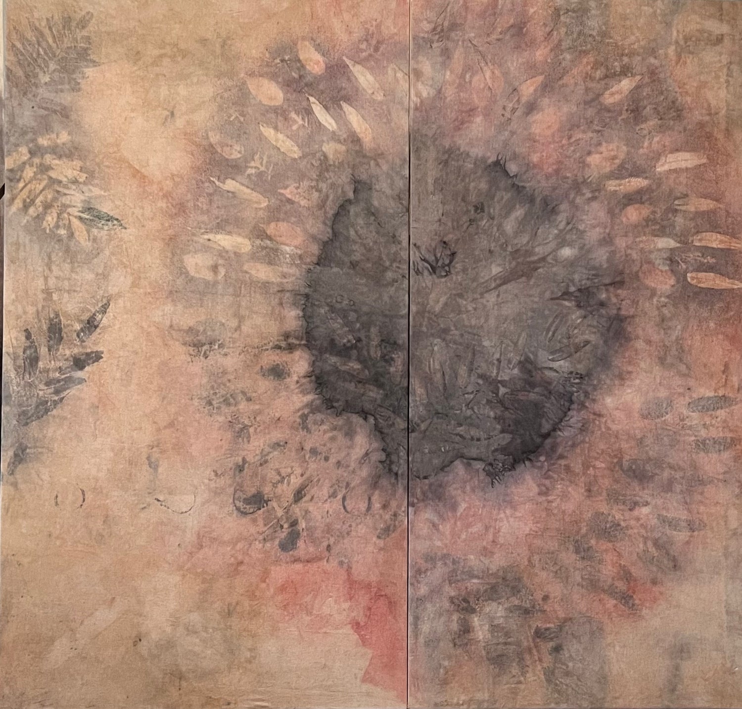 Natural dyes rhubarb, madder root, logwood, mulberry, oak, walnut, pomegranate, rhubarb and iron with pressed indigo and sumac leaves on a hemp twill from Cone Mills.