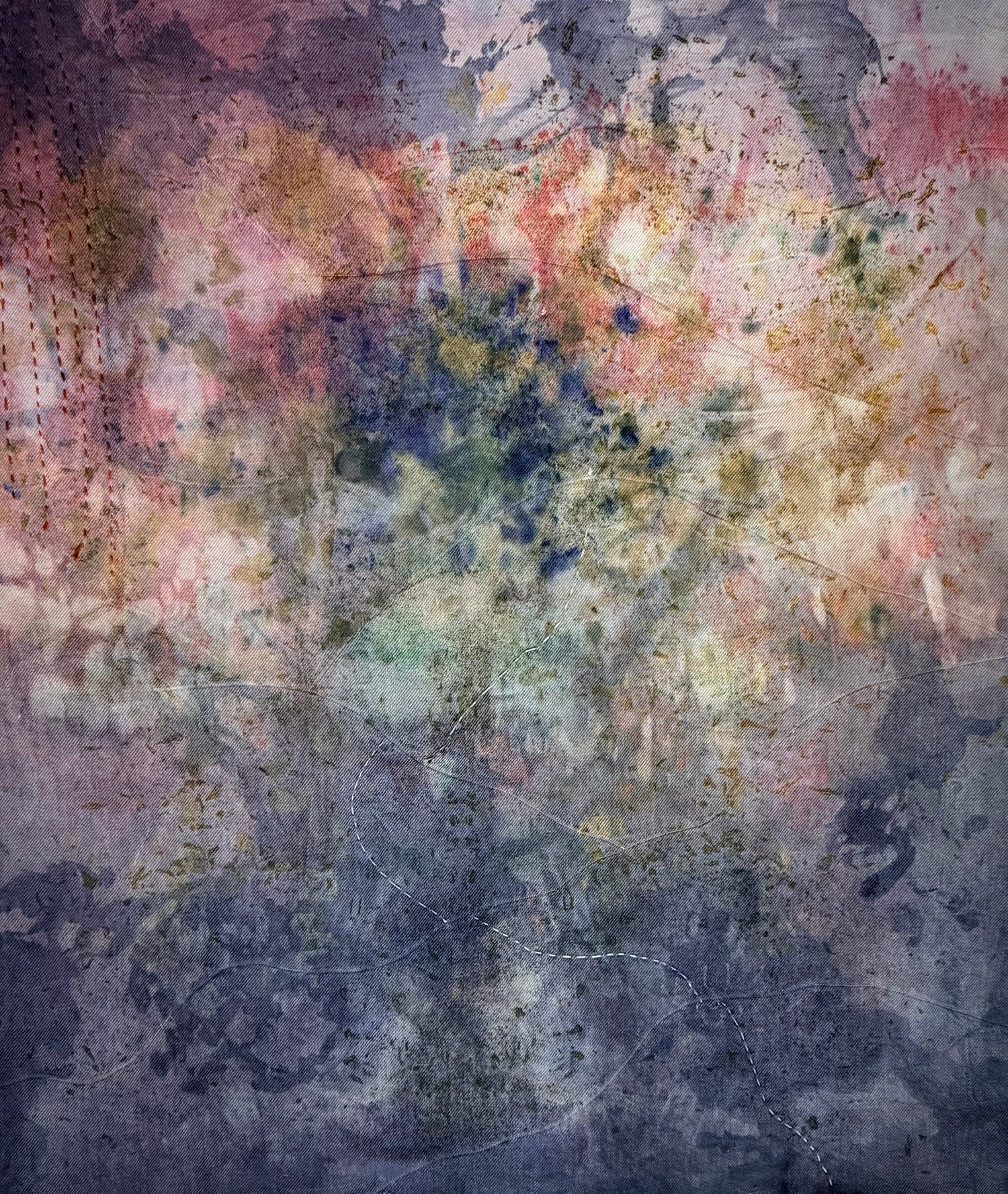 This piece is quilted on a wool batting with embroidered and stitched quilting lines of a mountain.