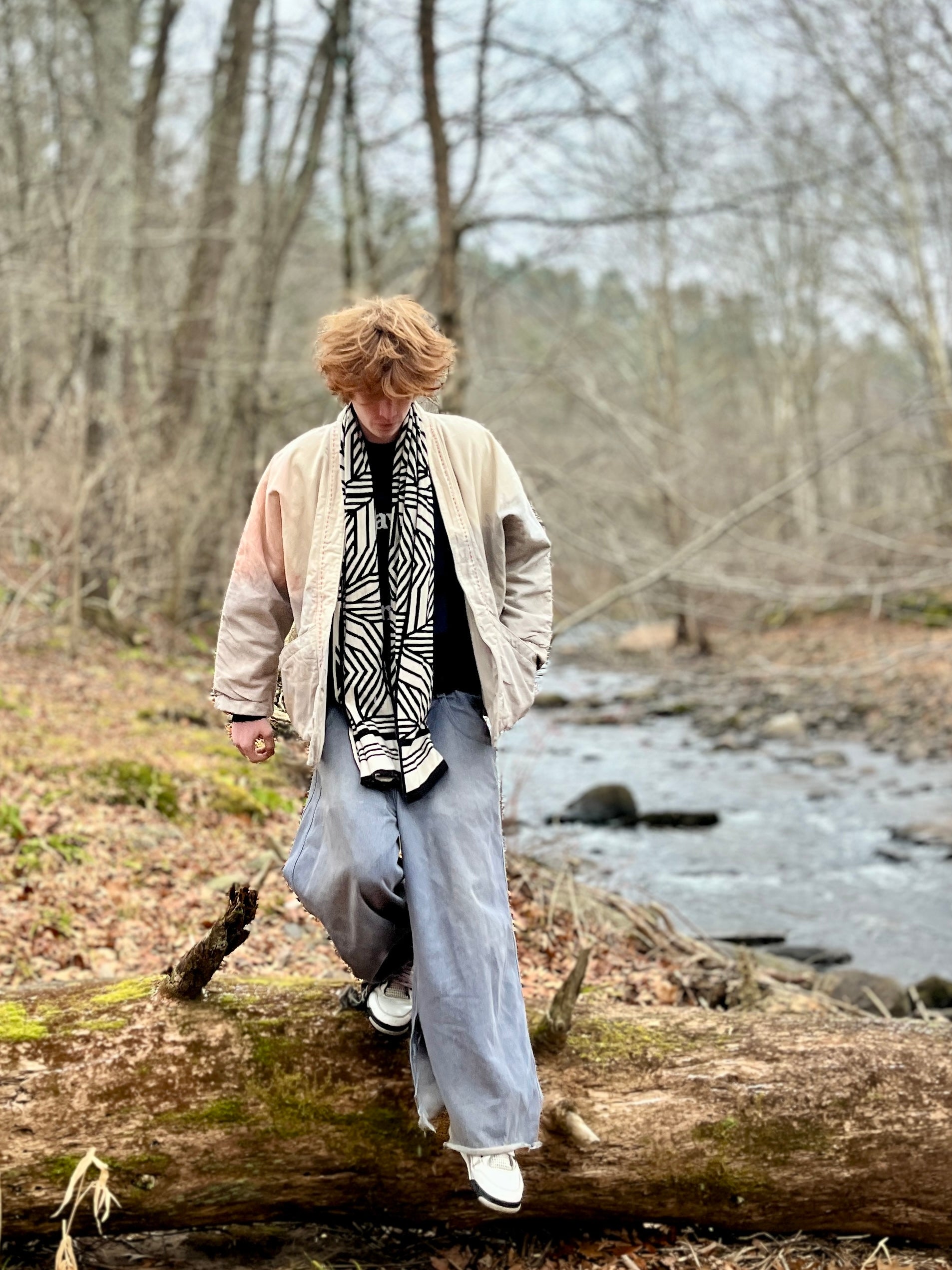 Dyed with madder root and marigolds with a botanical sprinkle and a touch of iron for a cloud pattern of pink, grey & yellow.