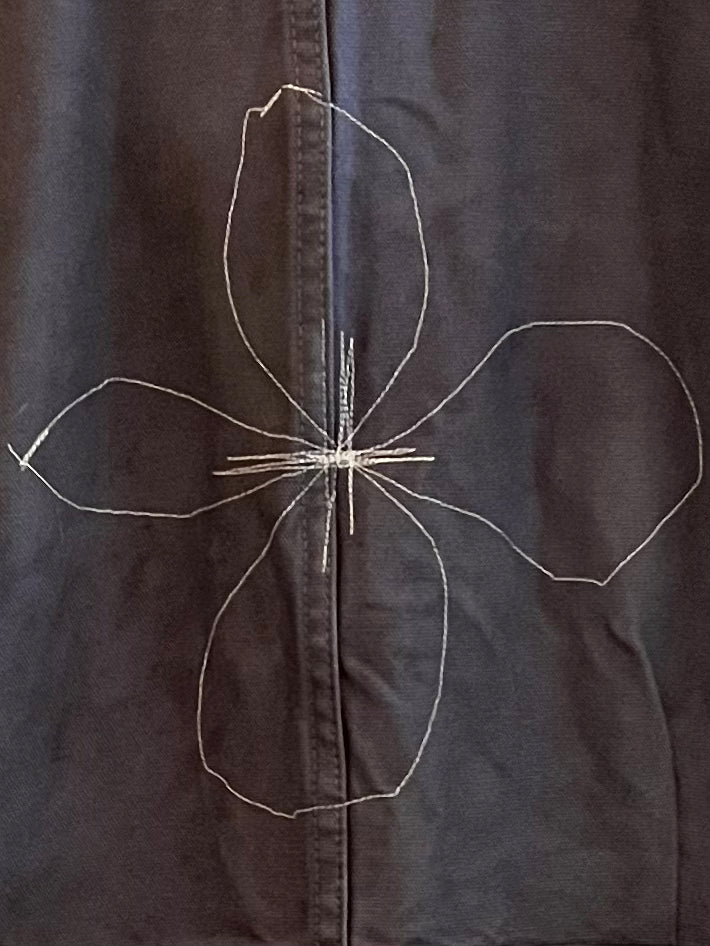 We chose to recycle a chore coat and coverall from light grey to indigo with touches of logwood for pops of purple marbling over the blue indigo. Each one is adorned with a flower on the back, stitched on with my machine. No two are alike. Just like us 🤍